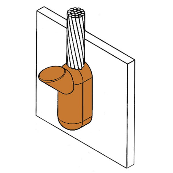 Vertical Cable (upwards) to Vertical Steel Surface Joint is a cable-to-surface exothermic welded connection that requires an HCD Handle Clamp with a chain.